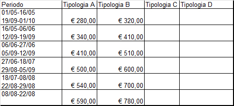 Qui sono indicati i prezzi delle varie tipologie dell’immobile corrispondenti ai diversi periodi stagionali: