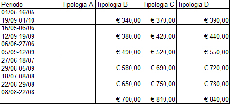 Qui sono indicati i prezzi delle varie tipologie dell’immobile corrispondenti ai diversi periodi stagionali: