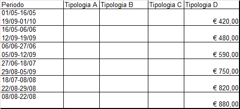 Qui sono indicati i prezzi delle varie tipologie dell’immobile corrispondenti ai diversi periodi stagionali: